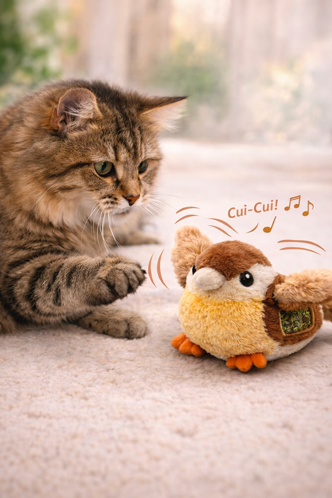 🐾 Activation par la patte : l’oiseau s’anime dès que votre chat le touche
